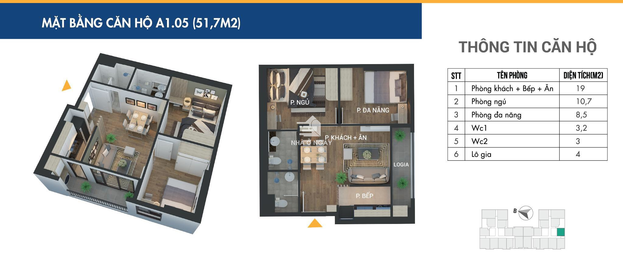 DT: 51,7m2, thiết kế 2PN, 2WC, cửa vào Tây Bắc ban công Đông Nam